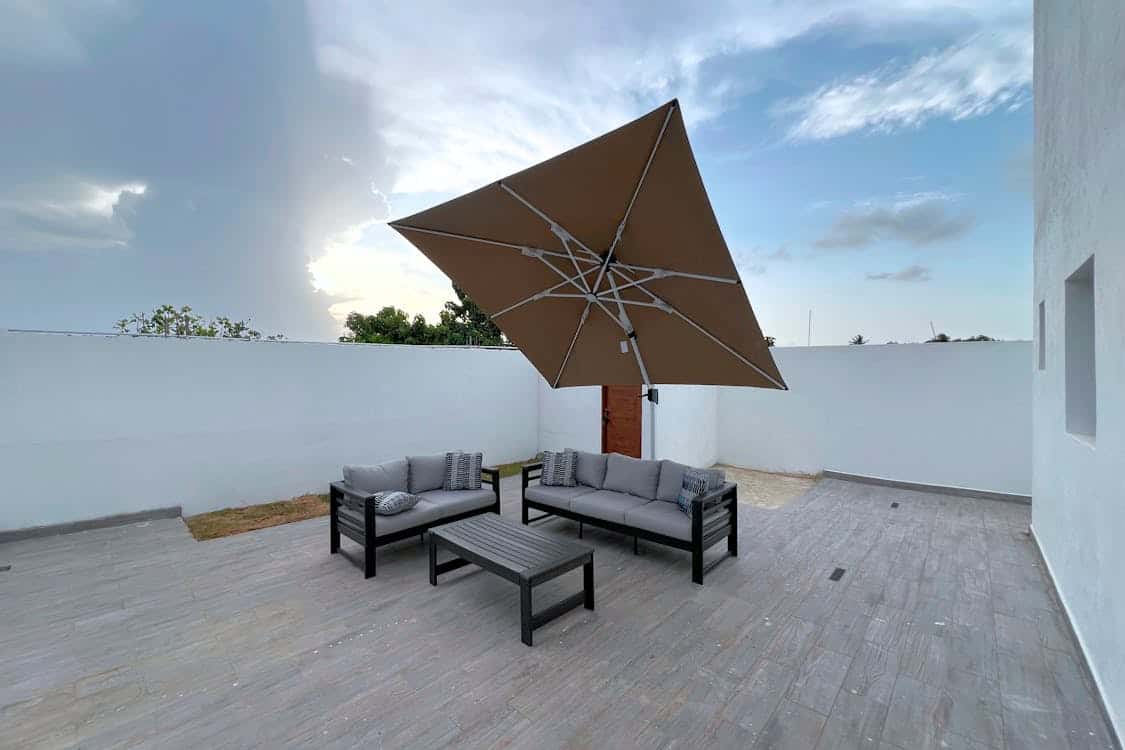 Cantilever models provide overhead cover without a center pole getting in the way of tables and loungers. When you fold them up on blustery days they stow away without leaving permanent hardware in place.